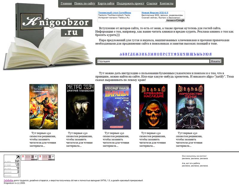 Этот пост я решил написать, чтобы заинтриговать тех, кто меня читает. Возможно, некоторые из вас уже в курсе, что я давно хотел открыть сайт о книгах. Задумка появилась примерно год назад. Во всяком случае в мае прошлого года она уже была у меня в голове. Жаль только, что все некогда было это сделать. Теперь же, всего лишь за последние 2 дня я сильно продвинулся в этом деле. Слева на скриншоте вы можете видеть дизайн будущей главной страницы Книгообзора.