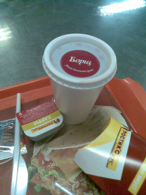 Просто борщ был таков, как на картинке слева (кстати фоткал на новую Нокию, о которой тут писал раньше, а потом ужал немного в фотошопе). Я не ожидал, честно) Питьевой борщ меня удивил. И, честно сказать, мне он не понравился. Такое впечатление, что этот борщ был, как суп из пакетика, который просто залили кипятком, но потом все же сверху накидали немного свежей петрушки. Нет, товарищи, уж борщей я пробовал много разных и в них немного разбираюсь) Еще не понравилось то, что не дали сметаны. А ведь борщ со сметаной (вытирает слюни с клавиатуры) это просто обалденно! Дали булку белого хлеба, впрочем какую-то не самую свежую, не черствую, но и не свежую. Порадовало то, что я еще угадал с другими блюдами в соседней от Ростикса точке общепита))) Но вот, к сожалению, не нашел там нигде своего любимого кваса. Обидно.