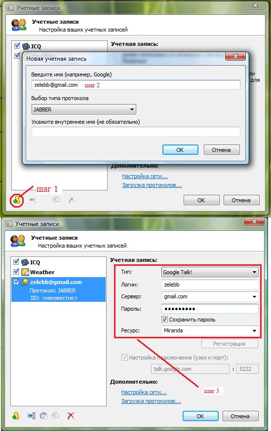Для начала нужно скачать Miranda IM zeleboba's pack., потом скачиваем jabber-плагин для миранды (http://slil.ru/26627596 или http://stream.ifolder.ru/10449166). Еще его можно выдрать из последнего ночного билда (http://www.miranda-im.org/development/). Теперь jabber.dll копируем в папку плагинов миранды. После запуска миранды идем в главное меню-учетные записи. Далее смотрим картинку пояснение: выполняем шаг 1, выбираем тип протокола jabber, вводим название. Я ввел свое, но ввести туда можно, что угодно (шаг 2). Переходим к шагу 3: если настраиваем для gmail аккаунта Jabber, то в списке тип выбираем google talk, вписываем свой логин, пароль, жмем ок. Jabber через gmail настроен. Далее выставляем статус онлайн и начинаем узнавать, кто из друзей есть в этой сети ;)
